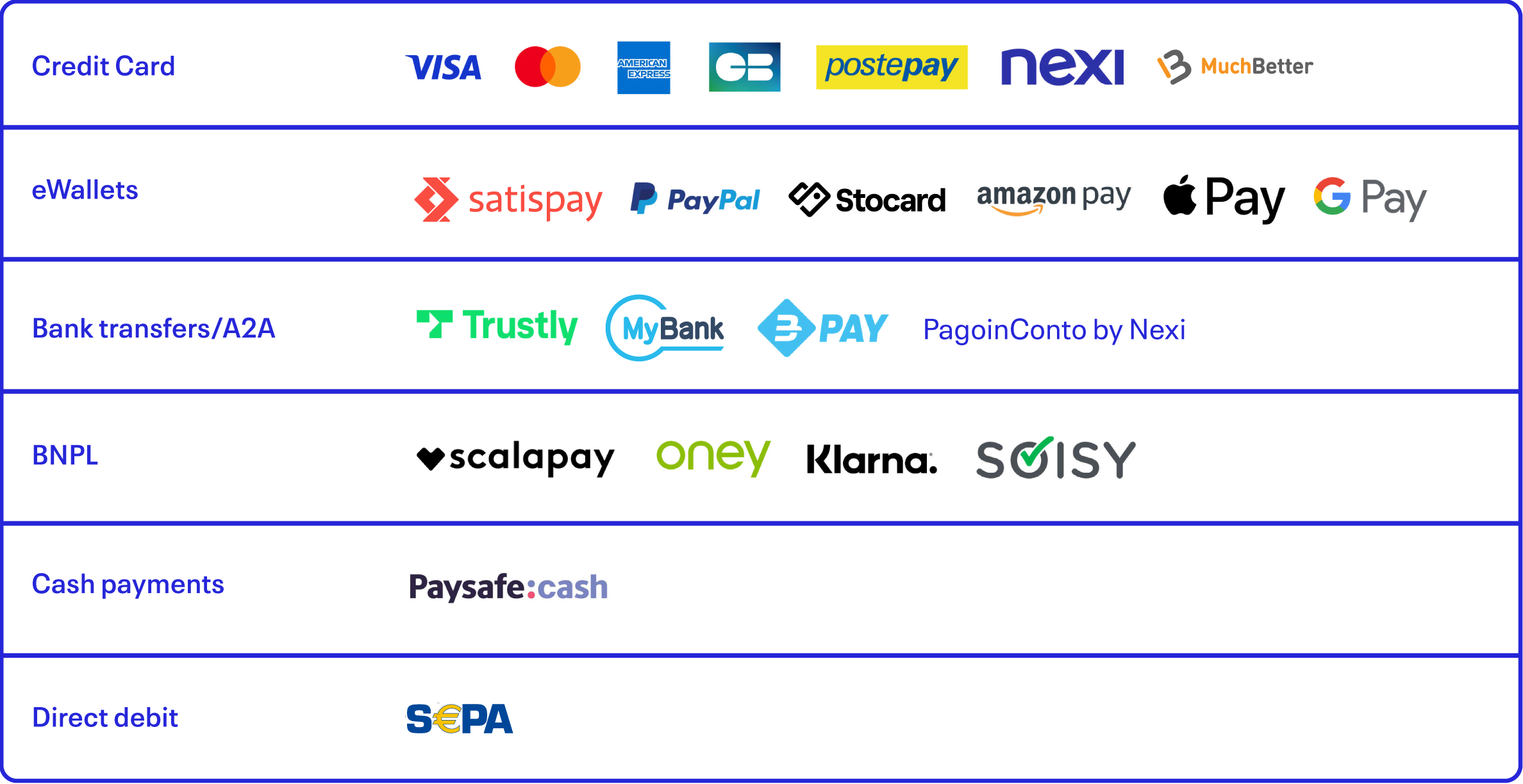 Following the introduction of the ‘Italia Cashless’ plan and further streamlined by the lockdowns, online payments grew in popularity – being preferred by 6 out of 10 Italians in 2020 – with credit cards, prepaid cards, and vouchers being used most often. Other noteworthy payment methods that experienced growth in the last couple of years are e-wallets (such as Satispay, Stocard, PayPal, Amazon Pay, Apple Pay, Google Pay), bank transfers (BancomatPay, MyBank, Nexi, Trustly), and BNPL (Soisy, Scalapay, Clearpay, Klarna).
